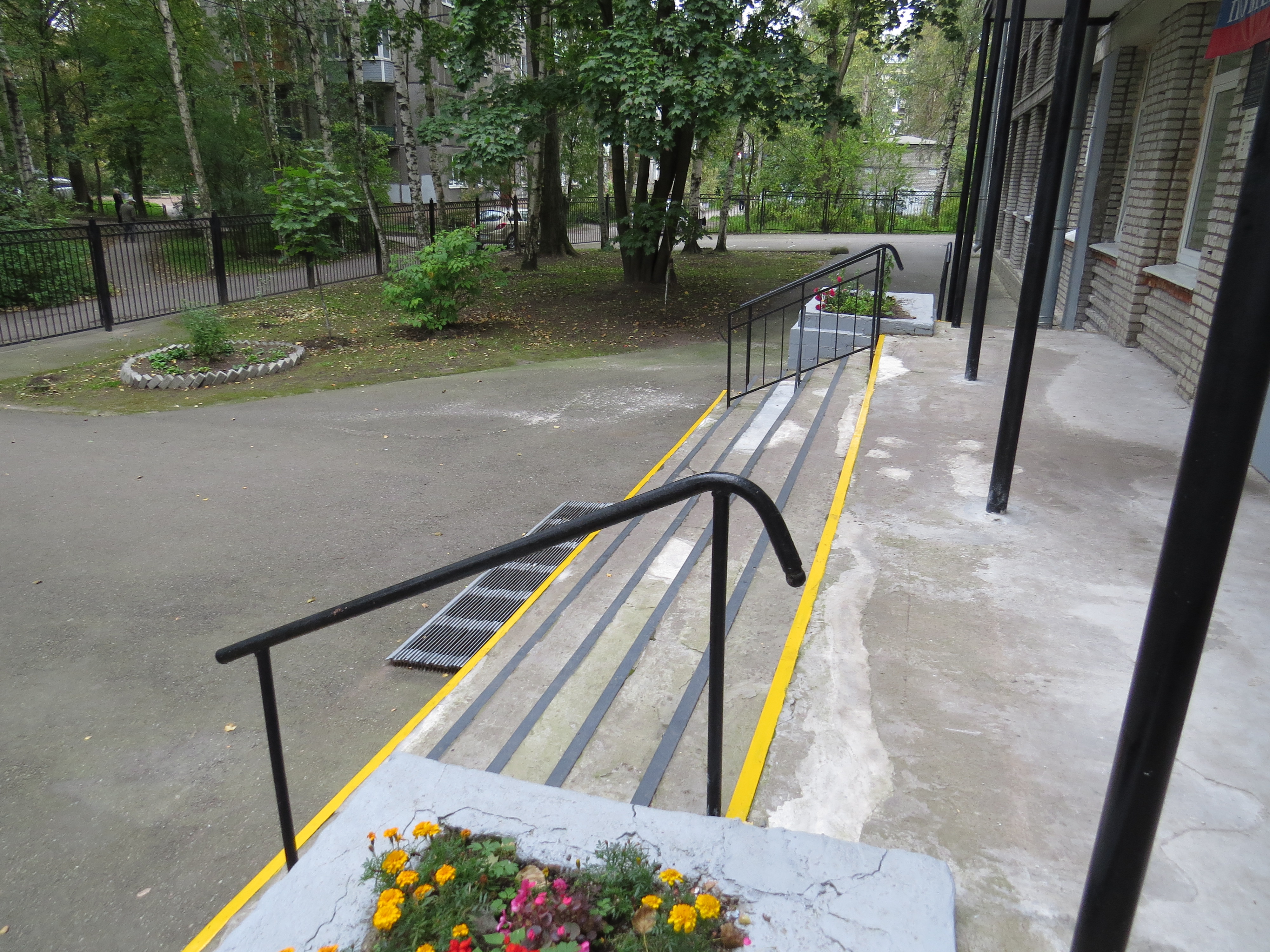 Наружная лестница входной зоны продублирована пандусом с поручнями.