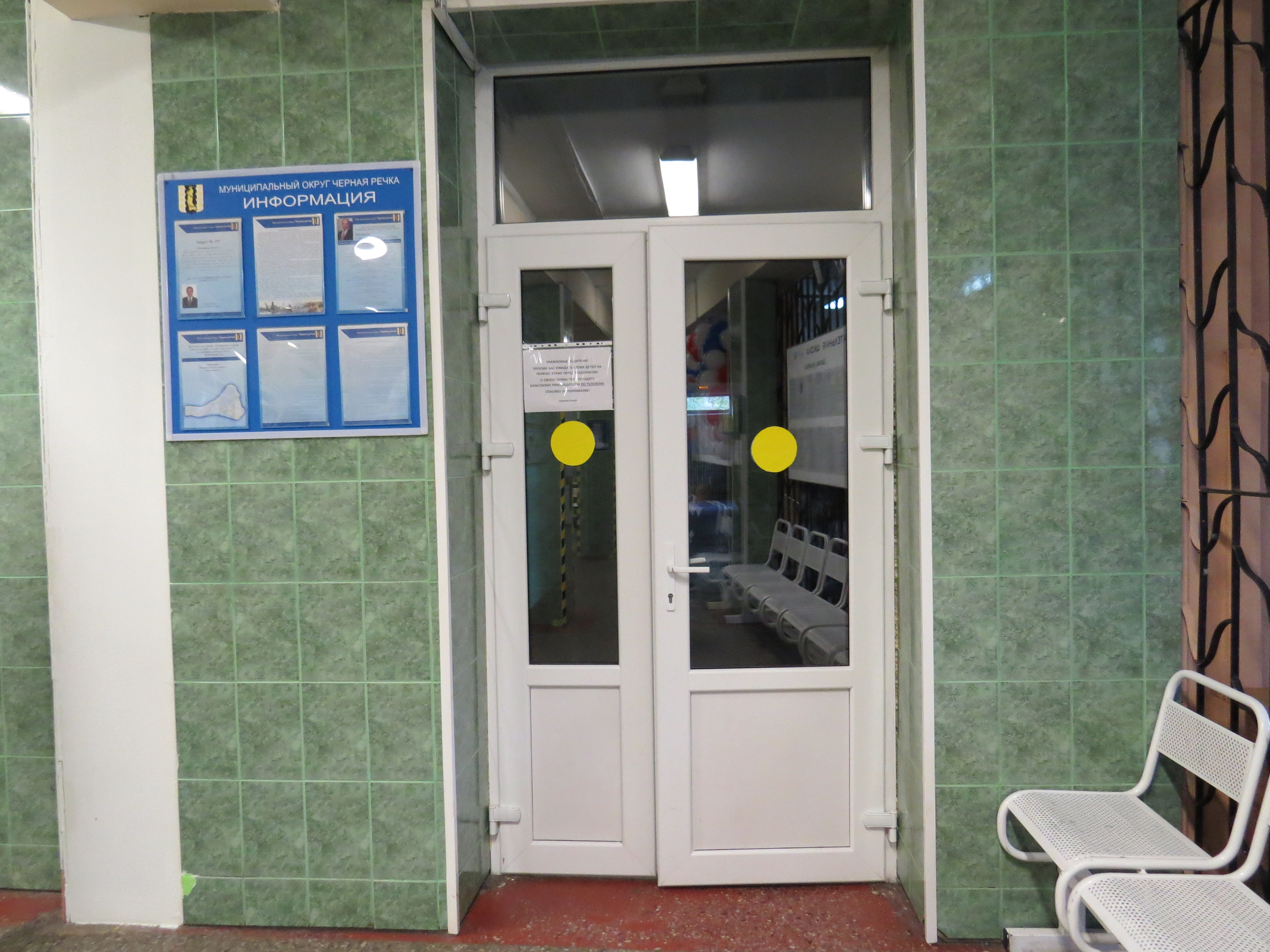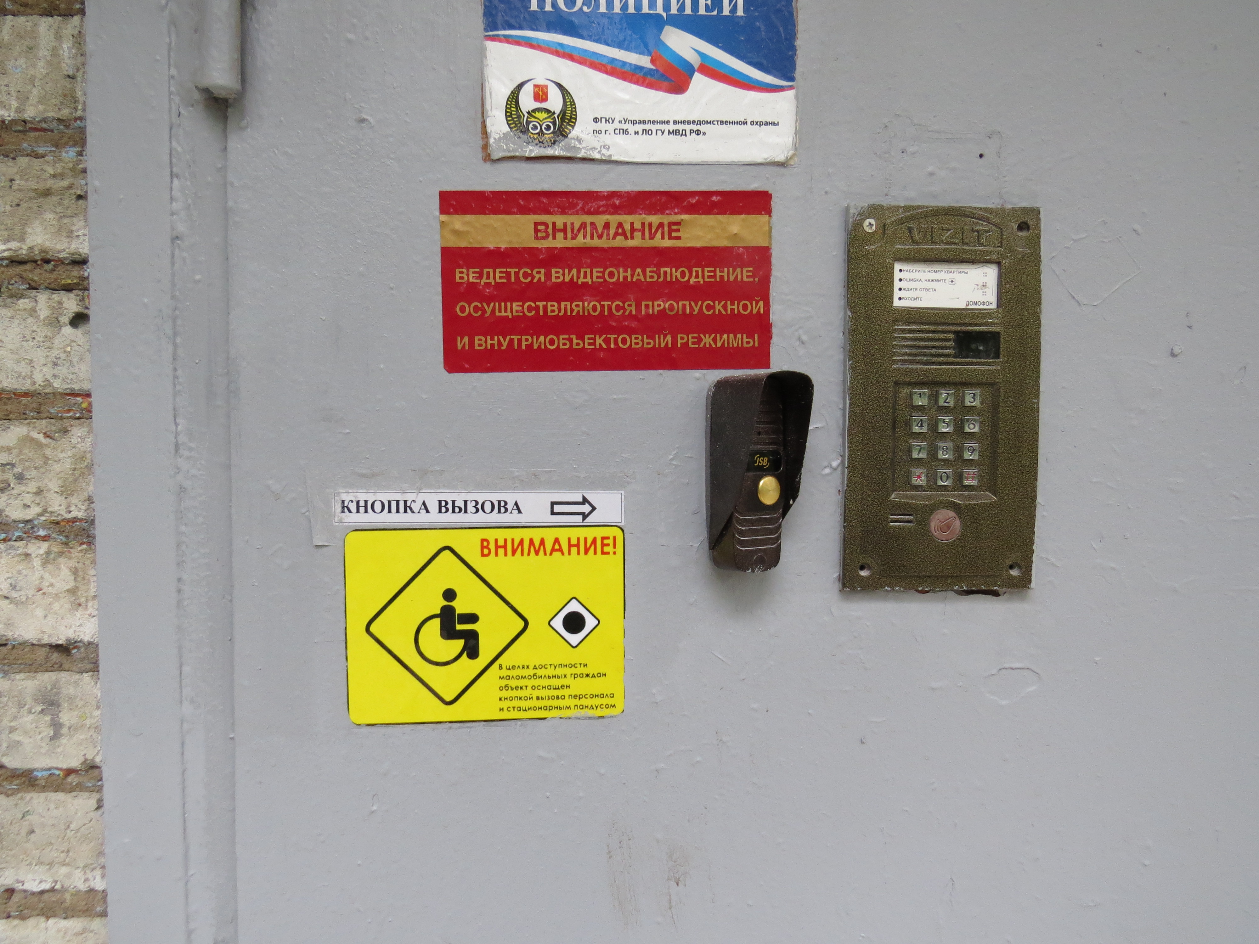 Табличка с названием учреждения на решетке ограждения отсутствует, на входе в здание продублирована табличка, исполненная шрифтом Брайля.