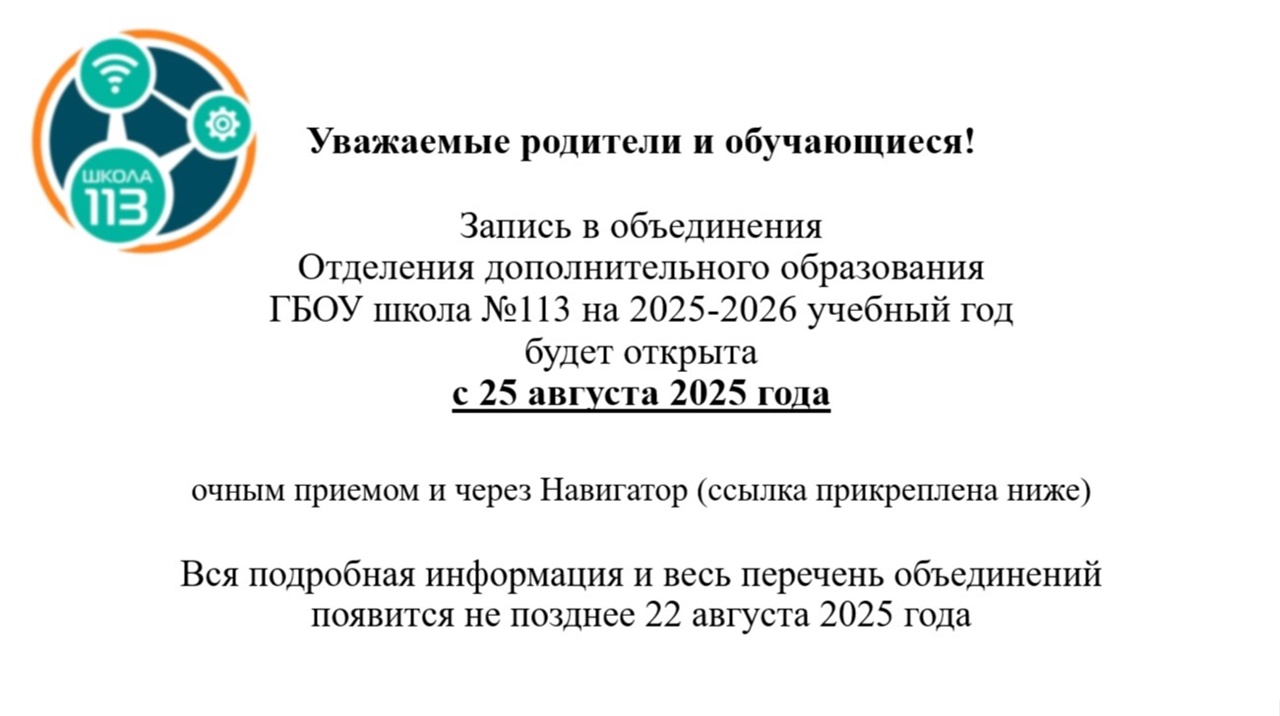 Администрация ГБОУ школа №113 Приморского района Санкт-Петербурга информирует вас о скором начале записи в отделение дополнительного образования детей (ОДОД) на 2025 — 2026 учебный год!
